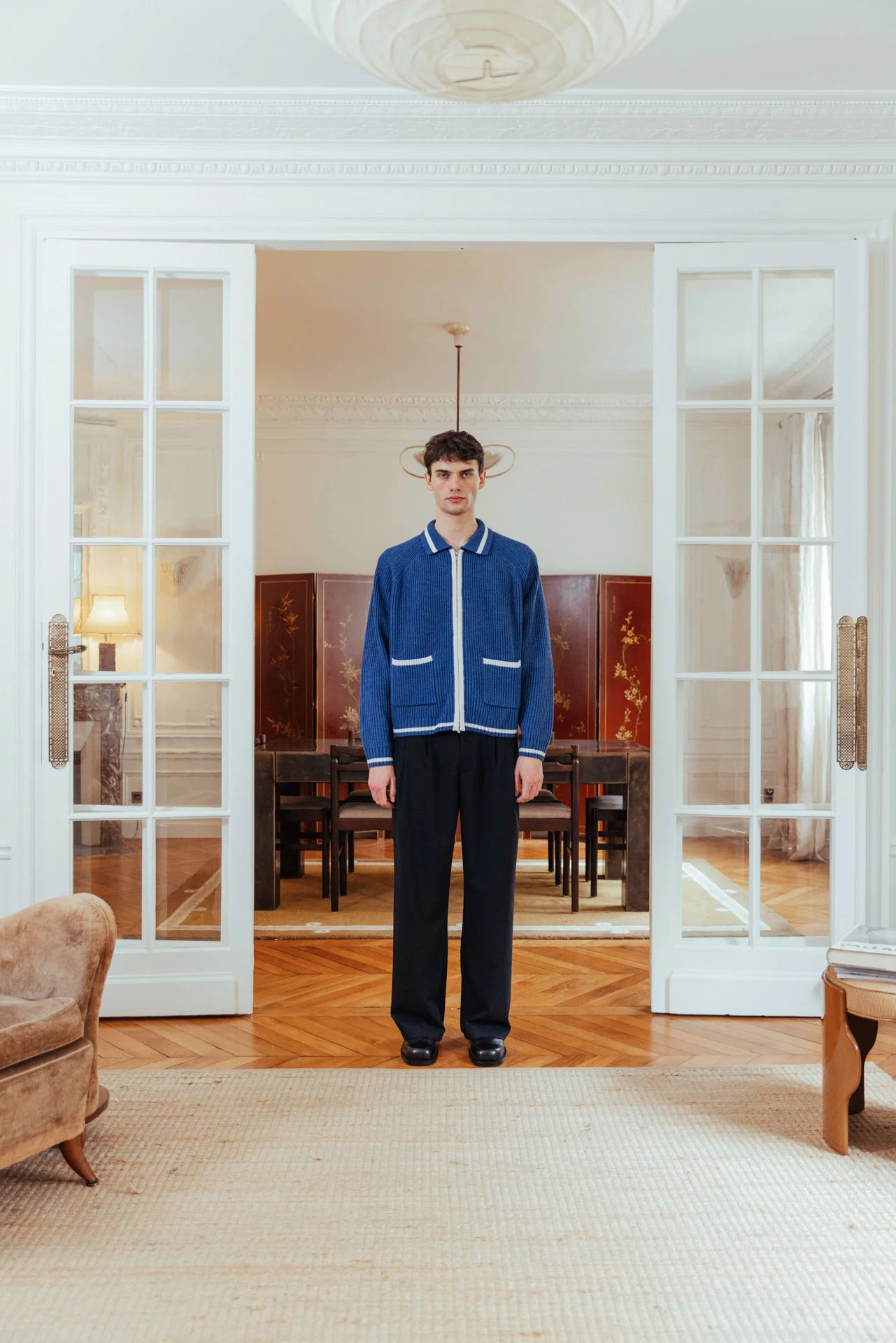 A boxy ribbed-knit zip-up cardigan in classic blue, cut with raglan sleeves for an easy, relaxed shape. Off-white contrast detailing traces the zip and openings for a playful accent. Finished with custom branded double-ended zips and front patch pockets.